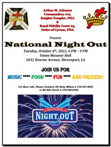 We will be performing a community project with the Sir Knights of Arthur M. Johnson #12 and Royal Ladies of Fidelity Court #5.